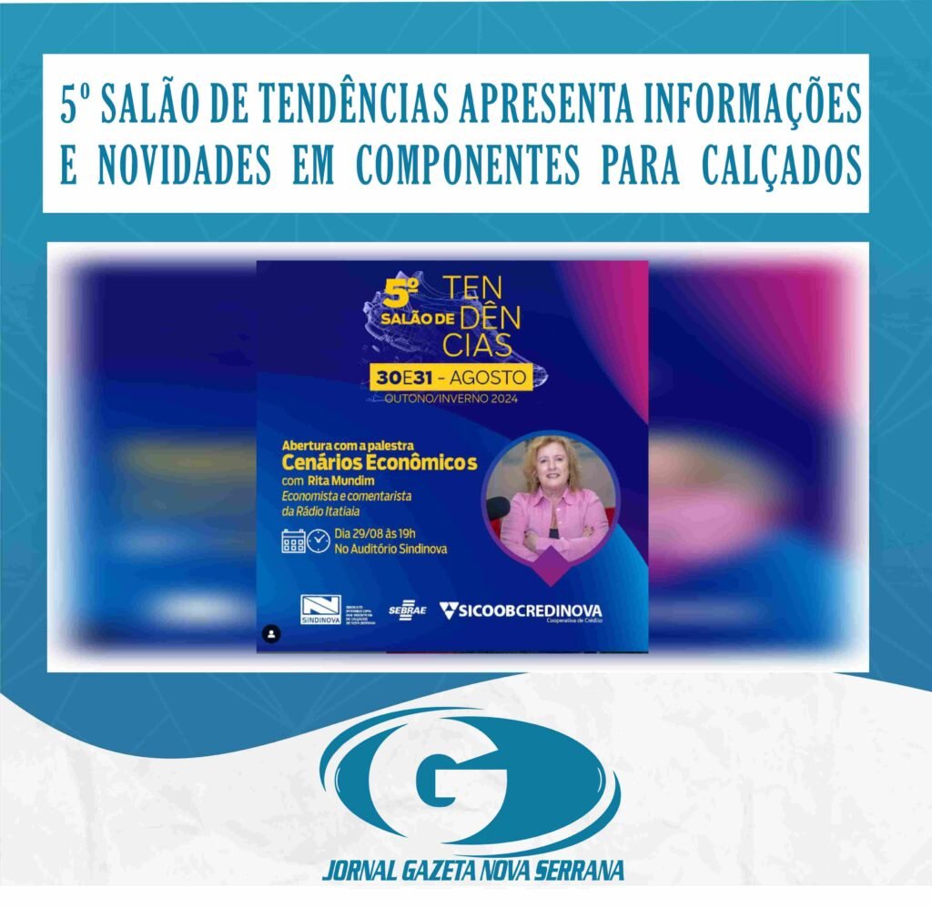 O Sindinova realiza entre os dias 29 e 31 de Agosto de 2023, o 5º Salão de Tendências. O encontro já está consolidado no calendário de ações do polo calçadista. A intenção é trazer as novidades da coleção outono/inverno 2024, além de informações para os empresários locais. A programação inicia na segunda (29) com uma palestra da economista e comentarista Rita Mundin, às 19h, no Espaço Sindinova.