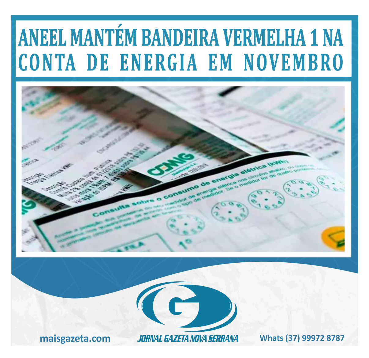 A Agência Nacional de Energia Elétrica (Aneel) anunciou na sexta (31) a manutenção da bandeira vermelha patamar 1 irá vigorar no mês novembro. Isso significa que as contas de energia elétrica terão adicional de R$ 4,46 para cada 100 quilowatts-hora (kWh) consumidos.