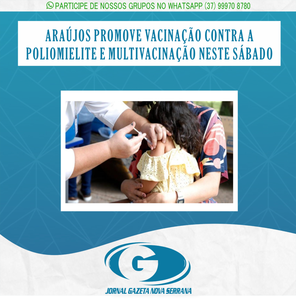 A Prefeitura de Araújos promove, neste sábado (3), o Dia D contra a Poliomielite e de Multivacinação. A ação acontece de 7h às 12h nas unidades de saúde do município. É preciso levar o cartão de vacina e um documento de identificação.