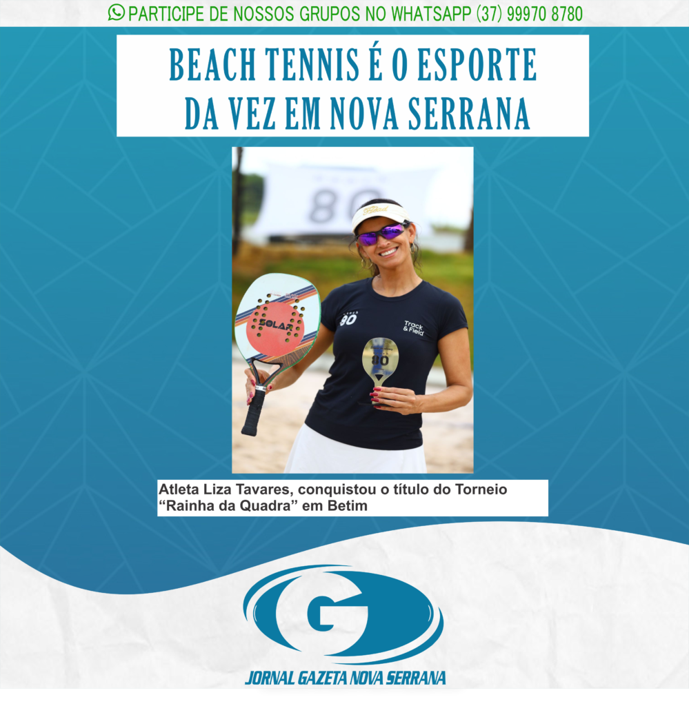 A atleta de Nova Serrana, Liza Tavares conquistou, no último sábado (2), o título do Torneio de Beach Tennis “Rainha da Quadra” realizado em Betim (MG). Liza levou o primeiro lugar na categoria Intermediária. O torneio contou ainda com as categorias Estreante e Iniciante com cerca de 50 participantes.