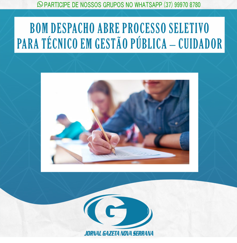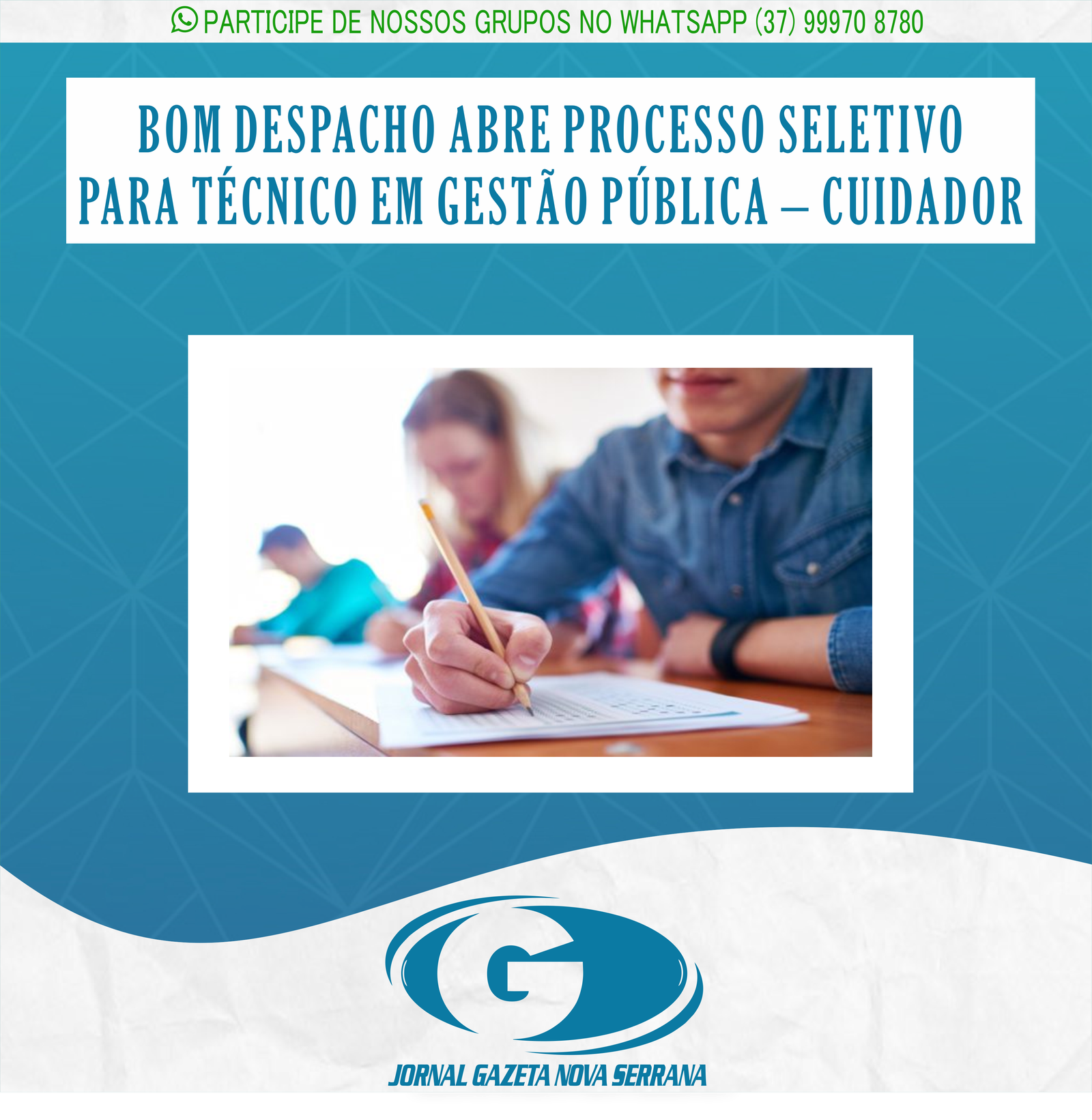 A Prefeitura de Bom Despacho abre, na segunda-feira (22), as inscrições do Processo Seletivo 3-2022 para preencher quatro vagas para o cargo de Técnico em Gestão Pública – Cuidador. O prazo termina às 17h do dia 5 de setembro.