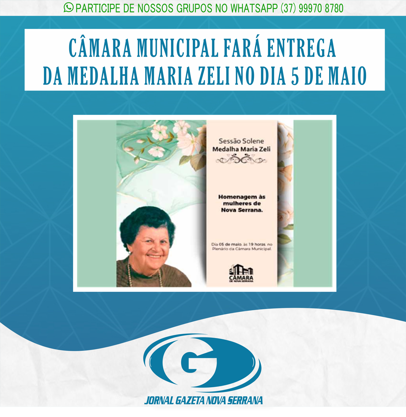 A Câmara Municipal de Nova Serrana realizará no dia 5 de maio, às 19 horas, uma solenidade para outorga da Medalha Maria Zeli. A honraria foi instituída com o objetivo de homenagear as mulheres nova-serranenses, sendo assim, anualmente a sessão de homenagens ocorre no mês de março, quando se comemora o Dia Internacional das Mulheres. Neste ano de 2022, devido à manutenção no teto do plenário da Câmara, a solenidade de outorgada da Medalha Maria Zeli foi adiada.