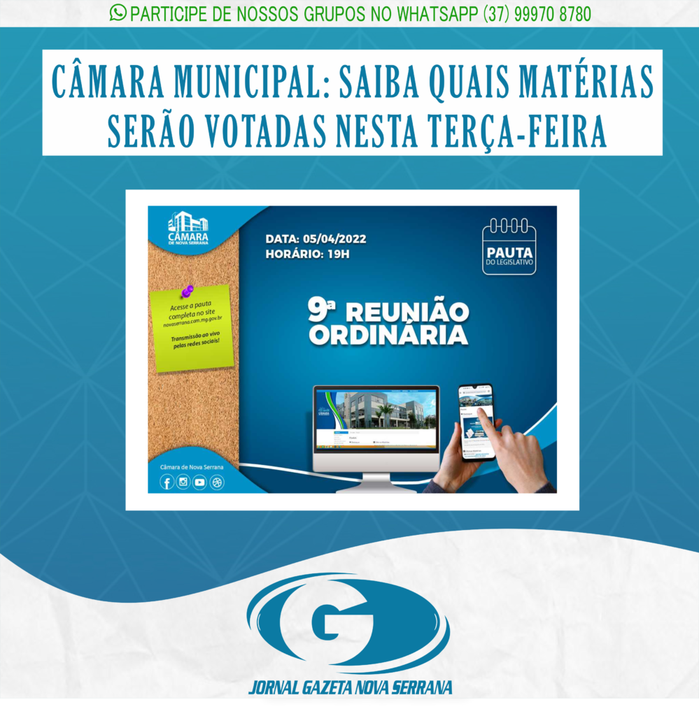 A 9ª reunião ordinária da Câmara Municipal de Nova Serrana será realizada nesta terça-feira (5), às 19h. Veja as matérias para votação: