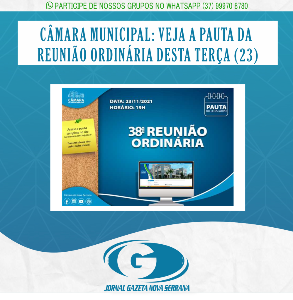 A 38ª reunião ordinária será realizada nesta terça-feira (23), às 19h, na Câmara Municipal de Nova Serrana. Confira as matérias para votação: