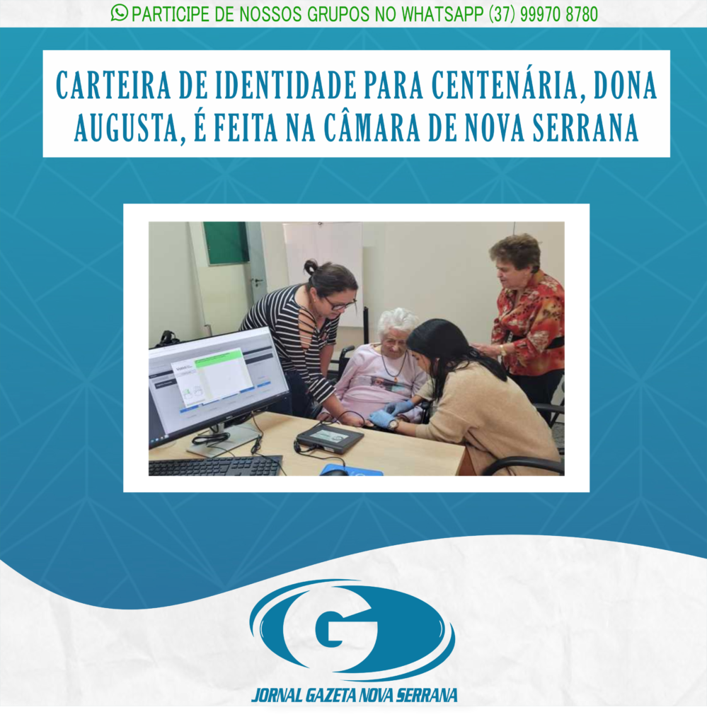 Dona Augusta Moreira da Silva, conhecida como Dona Gustinha, retirou a 2ª via da carteira de identidade aos 107 anos. A moradora de Nova Serrana esteve na Câmara Municipal na última sexta-feira (1º) para realizar a emissão do documento. O último RG dela foi emitido há mais de 40 anos e não é mais aceito para algumas situações, como o recebimento do benefício previdenciário, por exemplo.