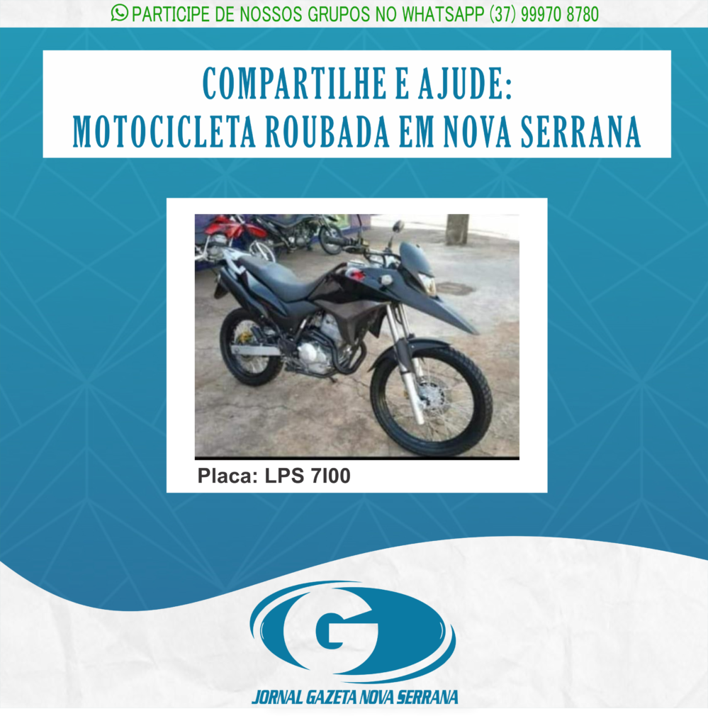 Uma motocicleta foi roubada na noite dessa quarta-feira (27), em Nova Serrana. O crime foi registrado por volta de 22h30 no bairro Concesso Elias.