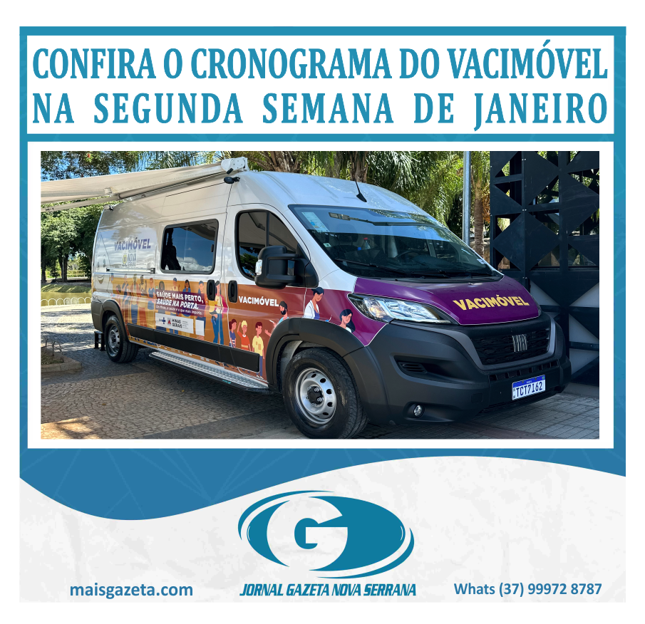 A Prefeitura de Nova Serrana divulga o cronograma do Vacimóvel para a segunda semana de janeiro de 2026. Entre os dias 12 e 16 de janeiro, a unidade móvel estará em diferentes pontos da cidade, com horários alternados, facilitando o acesso da população às vacinas e fortalecendo as ações de prevenção em saúde.