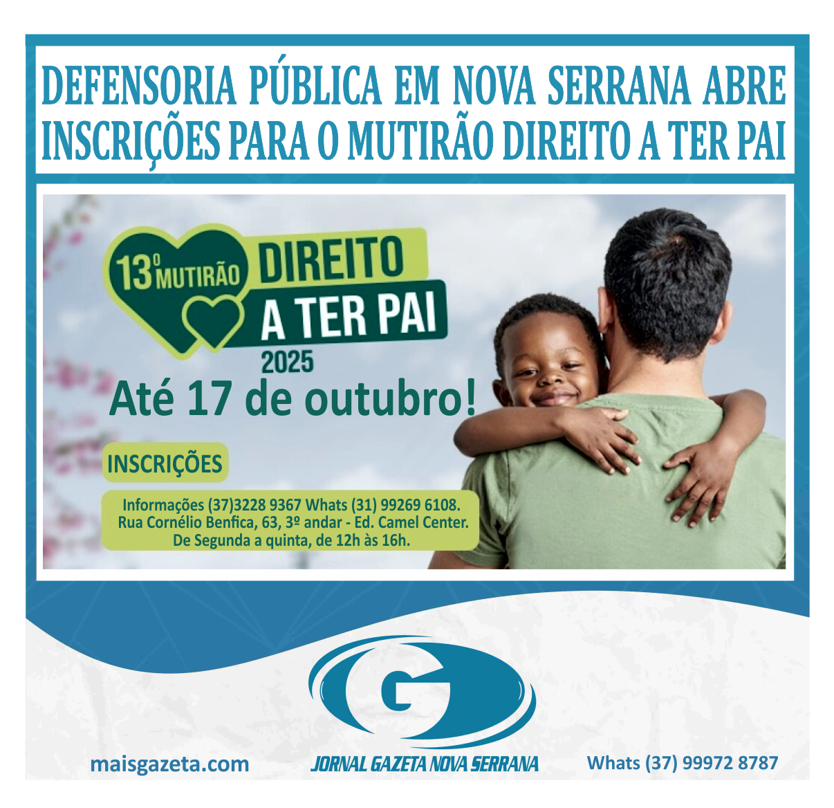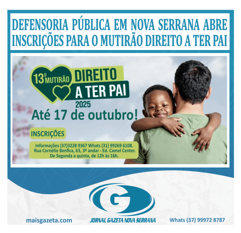 A Defensoria Pública de Minas Gerais (DPMG) promove a 13ª edição do Mutirão Direito a ter Pai em 36 Unidades de todo o estado. As inscrições podem ser feitas até o dia 17 de outubro.