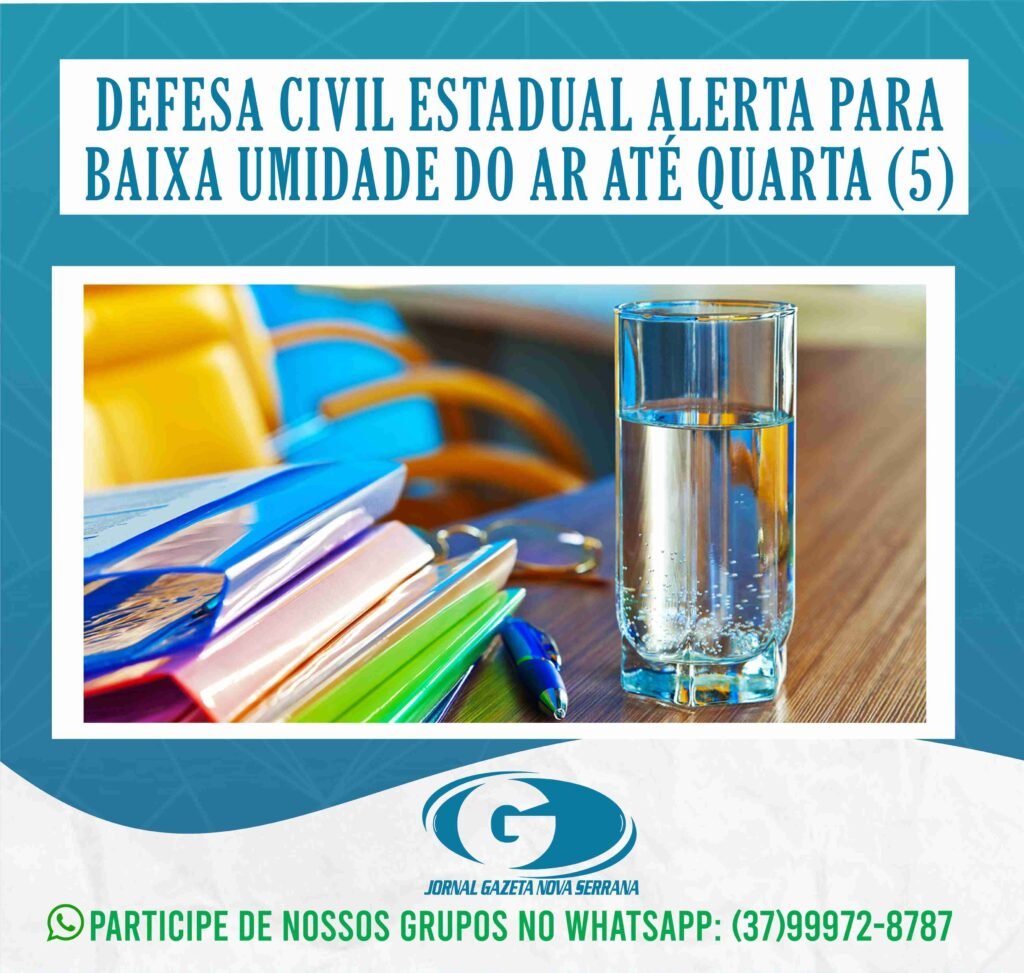 A Coordenadoria Estadual de Defesa Civil (Cedec) faz alerta para a população mineira diante da baixa umidade relativa do ar prevista para este início de semana, até amanhã, quarta (5/7). A queda é resultado de uma massa de ar seco que atinge boa parte do estado.