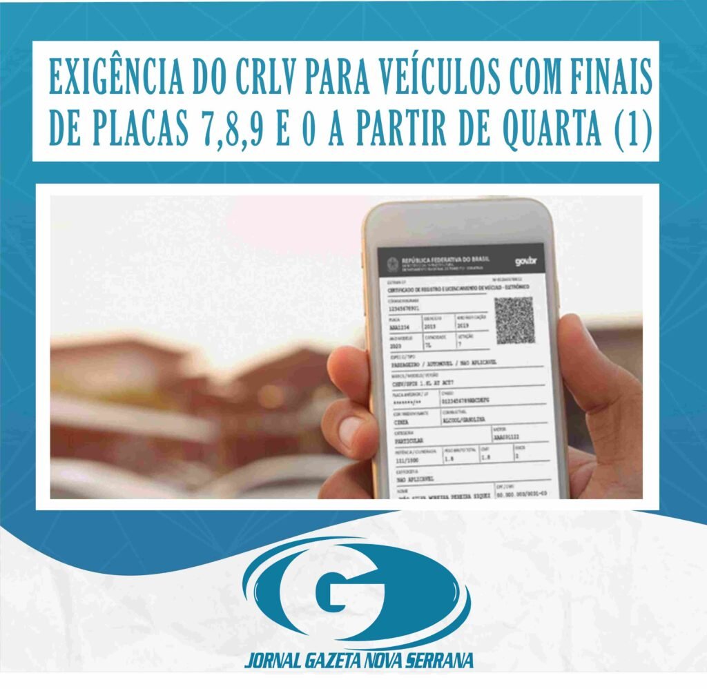 A exigência do Certificado de Registro e Licenciamento de Veículo (CRLV) de 2023 começa na próxima quarta-feira (1/11) para automóveis com finais de placa 7, 8, 9 e 0. A Secretaria de Estado de Planejamento e Gestão (Seplag-MG), por meio da Coordenadoria Estadual de Gestão de Trânsito (CET-MG), alerta os proprietários de veículos para ficarem atentos aos prazos.