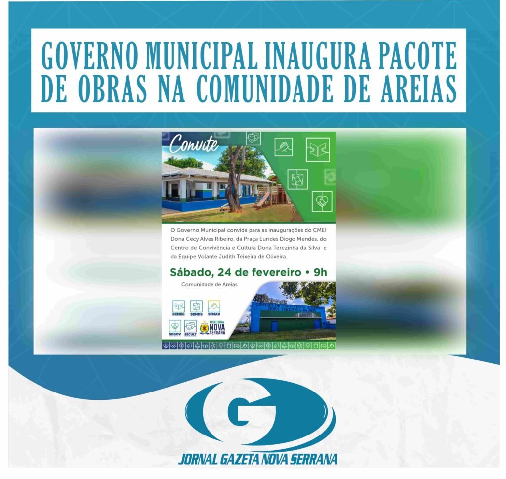 O governo municipal inaugurará neste sábado (24/2), uma série de obras realizadas na Comunidade de Areias. São elas: o Cmei Dona Cecy Alves Ribeiro, a Praça Eurides Diogo Mendes e o Centro de Convivência e Cultura Dona Terezinha da Silva.