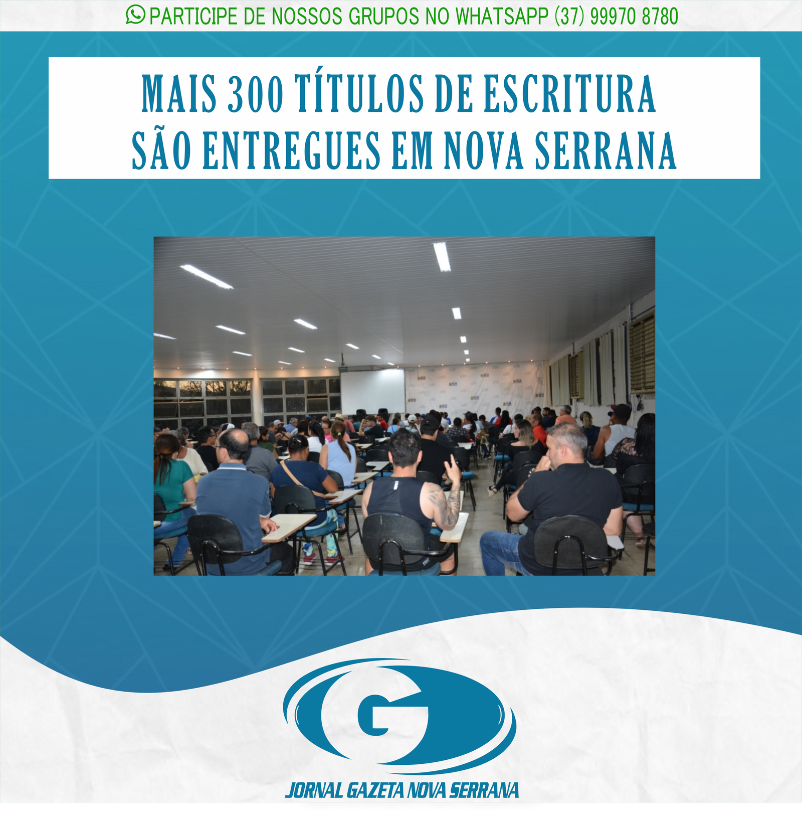 Cerca de 300 famílias de Nova Serrana receberam ontem (4), os títulos de escrituras imobiliárias definitivos e registrados em cartório. A ação faz parte do programa municipal de regularização fundiária crido pelo governo municipal e que já beneficiou quase 2 mil famílias. Segundo a prefeitura, em breve outros títulos serão entregues às famílias que se inscreveram no programa.