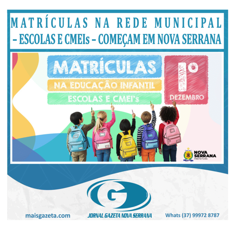 O cronograma de matrículas foi definido pela Comissão de Cadastro e Matrícula da Secretaria Municipal de Educação. A medida garante o planejamento adequado do ano letivo de 2026 e reforça o compromisso da gestão municipal com o acesso e a organização do ensino público infantil em Nova Serrana.