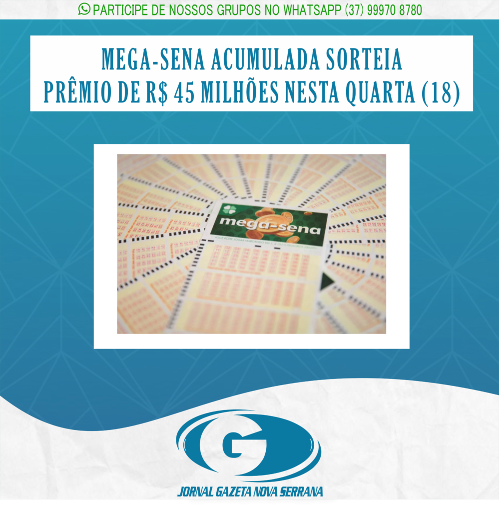 Ninguém acertou as seis dezenas do concurso 2.481 da Mega-Sena, que foi realizado no sábado (14) e o prêmio acumulou. Para o sorteio desta quarta-feira (18), o valor previsto para as apostas vencedoras é de R$ 45 milhões.
