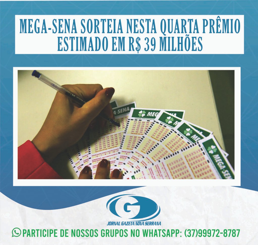 As seis dezenas do concurso 2.595 da Mega-Sena serão sorteadas a partir das 20h (horário de Brasília), no Espaço da Sorte, na Avenida Paulista, 750, em São Paulo, com transmissão pelo canal do Youtube e pelo Facebook das Loterias Caixa. O prêmio está acumulado e estimado em R$ 39 milhões.
