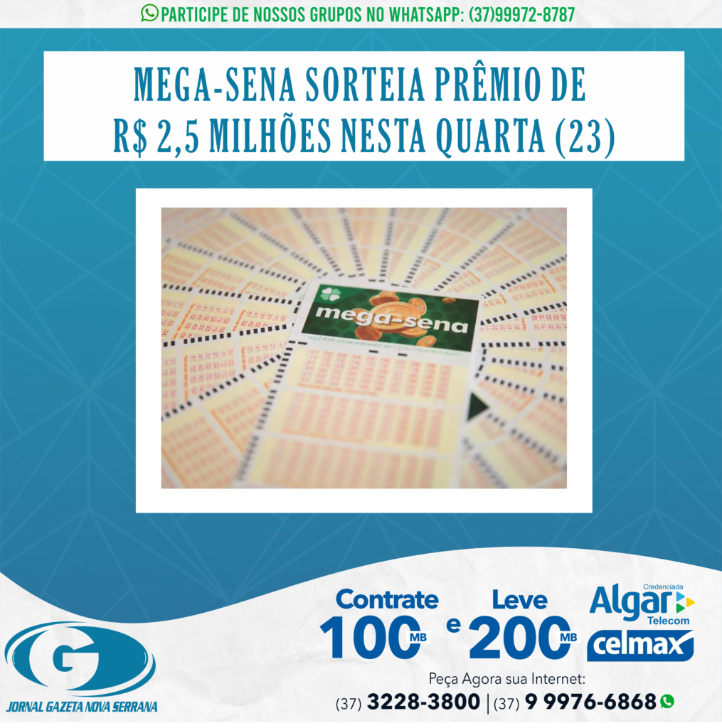 O concurso 2.383 da Mega-Sena será realizado nesta quarta-feira (23) e pode pagar R$ 2.5 milhões. No último concurso, sorteado no sábado (19), uma aposta de São Paulo acertou sozinha as seis dezenas e levou o prêmio de R$ 7 milhões.