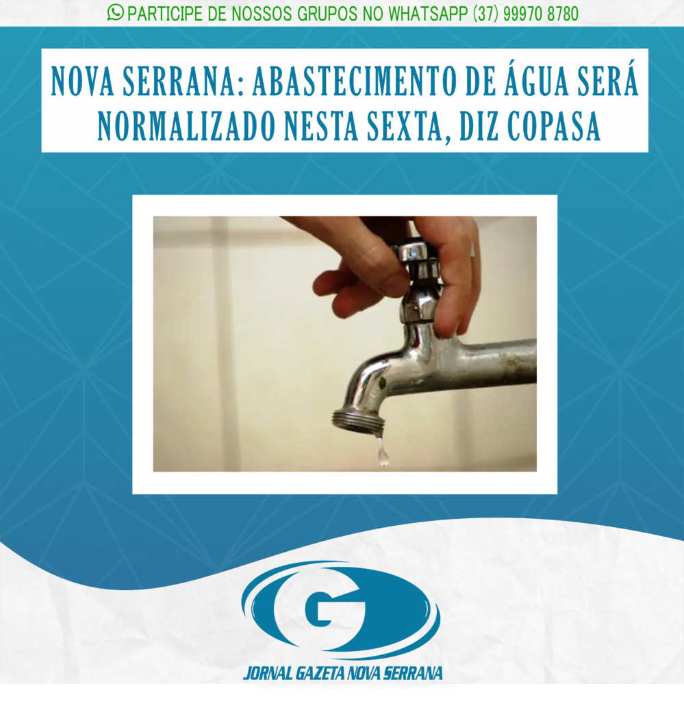 A Copasa informa que em razão de manutenção operacional em Nova Serrana, o abastecimento de água nos bairros Boa Vista, Planalto e Sandra Regina, foi interrompido, emergencialmente, nesta quinta-feira (1º).