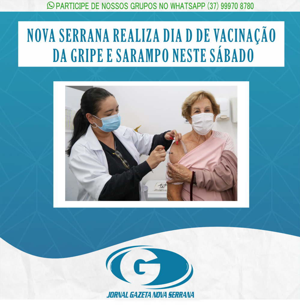A Secretaria de Saúde de Nova Serrana promove neste sábado, dia 30, das 8h às 15h, o dia D de vacinação contra Influenza (gripe) e contra o sarampo. A ação faz parte da 24ª Campanha Nacional de vacinação contra a Influenza e da 8ª Campanha Nacional de Sarampo.