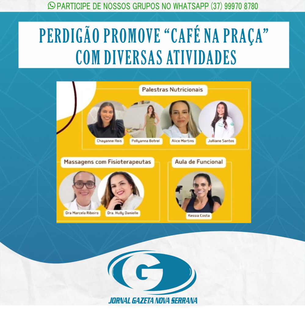 A Prefeitura de Perdigão promove, no dia 30 de abril, o evento “Café na Praça” repleto de atividades para animar o sábado da população. A ação será realizada de 8h às 11h na Praça da Matriz. Veja o que será promovido: