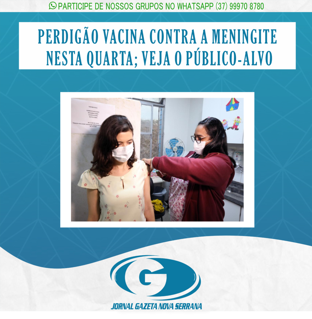 A Prefeitura de Perdigão promove, nesta quarta-feira (16), mais uma ação da Campanha de Vacinação contra a Meningite. Basta comparecer no PSF do Centro entre 16h e 18h30. Veja o público-alvo: