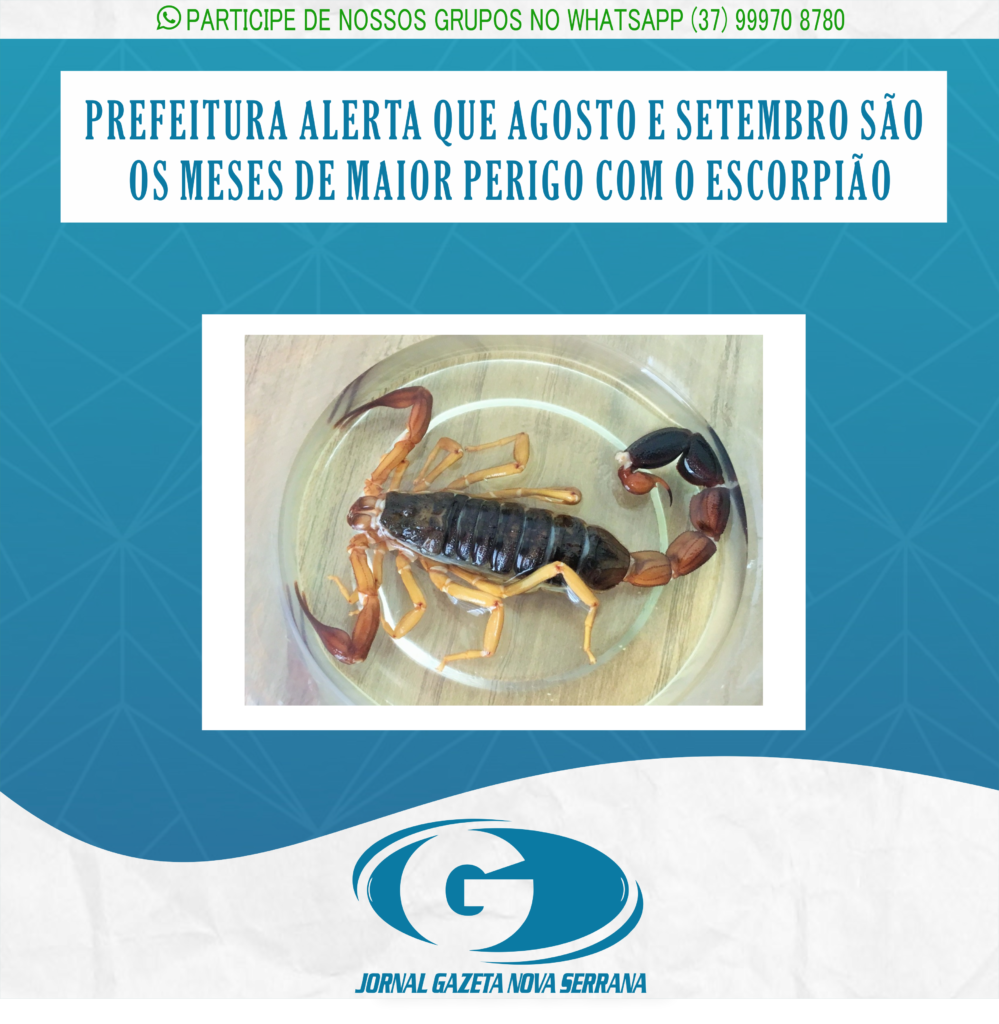 Escorpiões são avistados, encontrados e comunicados à Vigilância Epidemiológica de Nova Serrana, o ano inteiro. No entanto, nos meses de agosto e setembro este perigoso animal peçonhento se reproduz e, consequentemente são os meses em que a Vigilância recebe mais notificações sobre suas aparições. E, pior, época em que aumentam significativamente os casos de pessoas picadas por escorpiões.