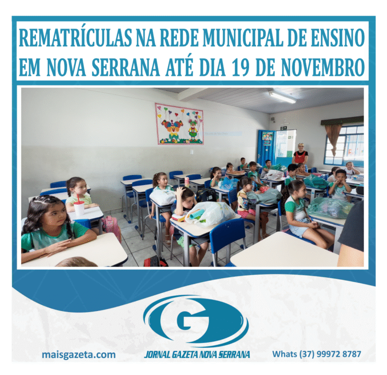 A Prefeitura de Nova Serrana, informa que está aberto o período de rematrículas para os alunos da Rede Municipal de Ensino, referente ao ano letivo de 2026. As famílias têm até o dia 19 de novembro de 2025 para realizar o procedimento, conforme cronograma estabelecido pela Secretaria Municipal de Educação.